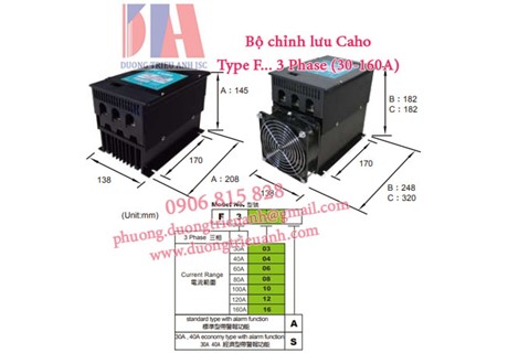 CAHO F303A ; F308-A; F316A là bộ chỉnh lưu 3 pha gồm các dòng điện 30A, 40A, 60A,80A,100A,120A,160A với điện áp AC220V-440V, tần số 50/60Hz. Hiện chỉnh lưu Caho được Công ty Dương Triều Anh phân phối chính hãng (Taiwan), tai6 thị trường Việt Nam. Có đầy đủ chứng từ , bảo hành , hỗ trợ kỹ thuật.